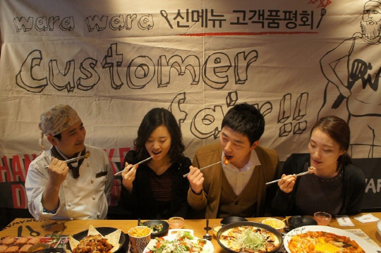 핸드 쿡드 다이닝펍 '와라와라'는 분기별 신메뉴 선정 과정에 고객 의견을 적극적으로 반영하고 있다. 메뉴 출시 전 고객들을 대상으로 고객품평회를 개최해 고객이 새로운 메뉴를 미리 맛보고 보완점에 대해 자유롭게 이야기하는 자리를 마련하고 있는 것이다. 상품개발팀에서 개발한 10여가지 메뉴 중 품평회에서 시식평이 좋았던 5개의 메뉴만이 새로운 상품으로 출시될 자격을 얻는다.
