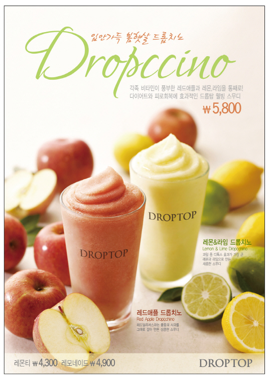 레몬라임 드롭치노는 상큼함의 대표 과일인 레몬과 라임을 사용해 지친 몸에 상쾌한 활력을 더해주는 음료다. 두 과일 모두, 비타민 A,C 등을 많이 포함하고 있어 피부 미용과 소화촉진에 효과가 있으며, 환절기 감기 예방에 탁월하다. 또한 레몬과 라임은 디톡스 효능이 가장 큰 과일 중 하나로, 여름을 앞두고 다이어트를 하는 준비하는 이들에게 적합하다. 가격은 각각 5,800원이다.