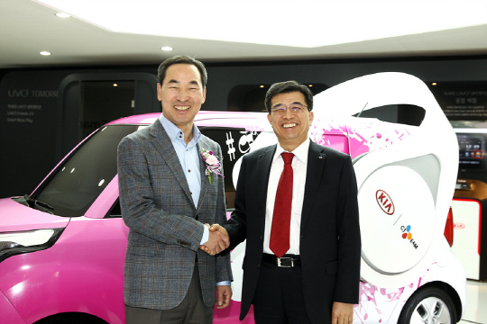 CJ E&M 강석희 대표이사(우)와 기아자동차 이삼웅 사장 (좌)이 28일 (목) 오전 킨텍스에서 열린 <2013 서울모터쇼> Press Day에 참석, 양사 전략적 제휴의 일환으로 진행된 '스마트 뮤직 서비스'를 선보이고 있다. '스마트 뮤직 서비스'는 운전자의 성별과 연령대에 따라 적절한 음악을 추천해주는 서비스로, 향후 기아자동차 내장 모니터를 통해 서비스 할 계획이다.