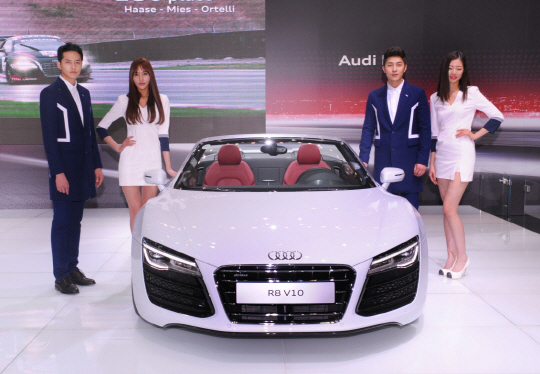 아우디 코리아는 초고성능 미드십 스포츠카 R8의 신차 '뉴 아우디 R8 V10 플러스 쿠페' 와 '뉴 아우디R8 V10 스파이더'를 국내 최초이자 이번 모터쇼 하이라이트카로 발표해 자동차 마니아들의 드림카로 관람객들의 마음을 사로잡았다. R8의 신차들은 다이내믹하면서도 우아한 디자인, 7단 S-트로닉 듀얼 클러치 자동변속기의 조합 등 디자인과 기술 혁신 면에서 진보하는 슈퍼카의 기준을 제시한다.
