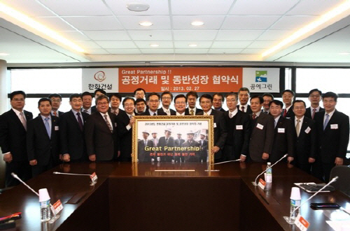 지난 2월에는 장교동 한화빌딩에서 '협력사와의 공정거래 및 동반성장 협약식'을 가졌다. 협약식에서는 2013년 올 한해 공정거래 질서를 확립하고 협력사들과 함께 동반성장의 결의를 다졌으며, 동반성장을 내용으로 한 협약을 협력사 대표들과 체결했다.