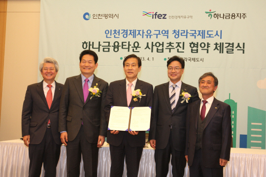1일 오전 11시 청라국제도시 베어즈베스트GC에서 김정태 하나금융그룹 회장, 송영길 인천광역시장, 이종철 인천경제자유구역청장이 참석한 가운데 '인천 청라 경제자유구역 하나드림타운 사업추진협약 체결식'이 개최되었다.