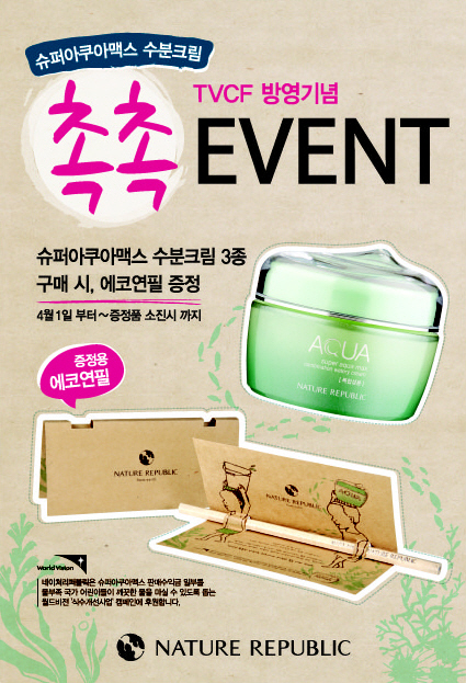 이번 이벤트는 신세경과 함께 촬영한 광고제품 '슈퍼 아쿠아 맥스 수분크림' 3종 가운데 한 개 이상을 구매한 고객에게 전국 매장과 온라인 쇼핑몰(www.naturerepublic.co.kr)에서 에코연필을 증정하는 행사다.