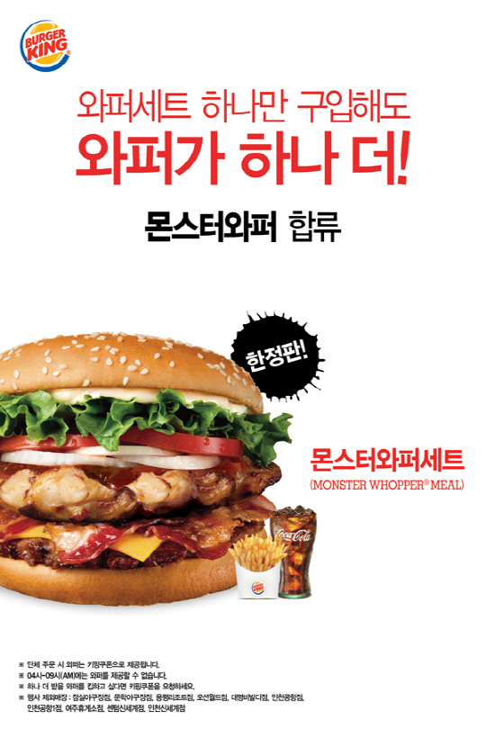 몬스터 와퍼는 4월 1일부터 4월 24일까지만 한정 판매되며 버거킹 전국 매장에서 만나볼 수 있다.(단, 인천공항점, 인천공항1점, 문학/잠실야구장, 대명비발디점, 오션월드점, 용평리조트점, 여주휴게소점과 부산센텀점, 인천신세계점 총 10개 매장은 행사에서 제외).