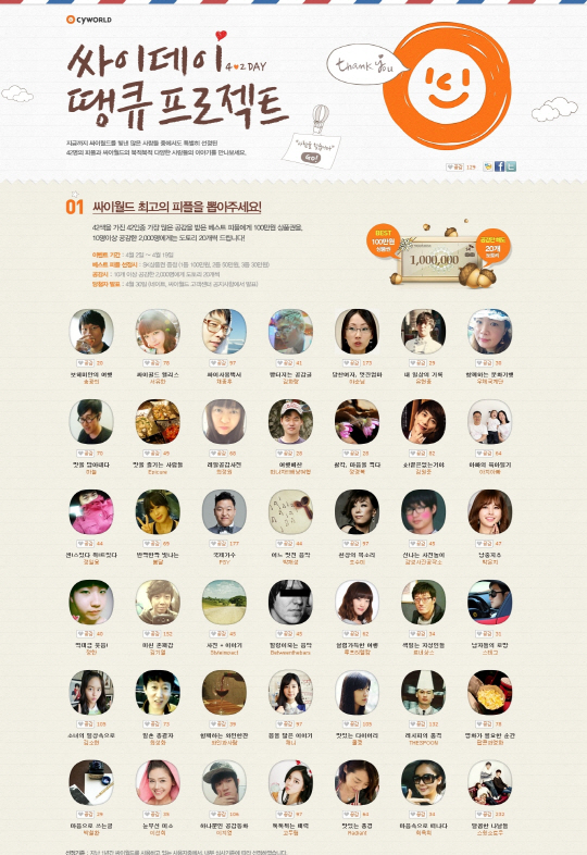 싸이월드를 빛낸 TOP 42에는 평소 미니홈피를 애용하는 소프라노 조수미, 아역배우 김소현, 가수 싸이 등의 싸이 스타들과 소소한 일상의 이야기들을 비롯해 직접 작업한 패러디 작품을 연재하는 등 정성이 묻어나는 포스팅들로 많은 사람들에게 사랑을 받고 있는 싸이월드 대표 블로거 '야순', 1000일이 넘게 육아일기를 작성해오며 화제가 됐던 인기 블로거 '아지아빠' 등이 이름을 올렸다.