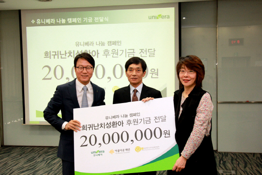 나눔캠페인은 2003년부터 시작된 유니베라의 대표적인 사회 공헌 활동으로, 참여를 희망하는 임직원과 대리점, UP(UP:Univera Planner, 유니베라 생활건강설계사)들이 매월 일정액을 기부하는 직장모금캠페인이다. 이렇게 모인 정성은 한국희귀난치성질환 연합회에서 진행하는 다양한 치유 프로그램과 환자들의 직접적인 치료비 지원 및 쉼터를 비롯한 각종 운영 사업에 사용된다. 전달식에서 이병훈 대표이사는 "유니베라는 개인, 이웃, 사회의 웰니스를 실천하는 기업이다"며 "이렇게 모인 작은 정성이 고통받는 아이들의 행복을 위해 아름답게 사용됐으면 좋겠다"고 말했다. 신현민 회장도 "희귀난치성질환을 앓고 있는 환자들은 국가의 혜택을 받지 못하는 어려운 상황에 있다"며 "소중한 기금으로 많은 환아들의 어려움을 덜어주는 의미 있는 곳에 사용하겠다"고 밝혔다.