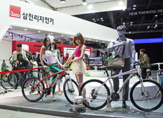 모터쇼에서 자전거 부스가 인기다. 삼천리자전거(www.samchuly.co.kr)는 2013 서울모터쇼에 자전거 완성차업체로 유일하게 참가해 관람객들에게 자동차 전시 부스에 못지않은 큰 관심을 받고 있다고 밝혔다.
