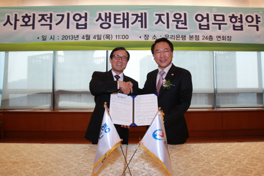 우리은행(은행장 이순우)이 회현동 본점에서 이순우 은행장과 방하남 고용노동부장관이 참석한 가운데 '사회적기업 생태계 지원을 위한 업무협약'을 체결했다.