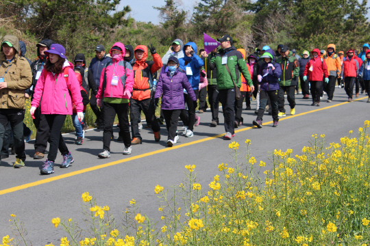 제주 튼튼병원(병원장 김래상)은 제주도민들의 걷기에 대한 인식을 높이고 척추관절 질환에 대한 올바른 정보를 제공하기 위해 7일(일) 서귀포 산방산 일원 둘레길에서 '주치의와 함께하는 힐링걷기대회'를 개최했다. '제15회 서귀포 유채꽃 국제걷기대회'에 공식 후원사로 참여해 진행된 이번 행사에는 제주 튼튼병원의 김래상 병원장과 이광열 부병원장을 비롯한 전 의료진과 환우 및 가족 300여명이 참가했다. 환우들은 그들의 주치의와 한 조를 이루어 5km 둘레길을 걸으면서 건강상담을 하고, 척추관절 질환의 예방과 치료법, 수술 후 관리 및 운동법 등에 대해 퀴즈로 재미나게 풀어보는 시간을 가졌다.