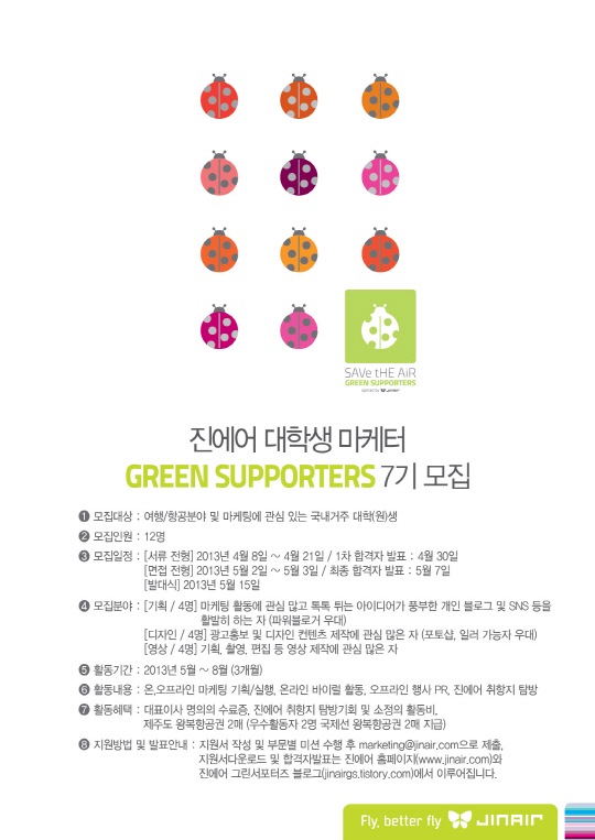 진에어는 선발 학생들의 마케팅 역량 강화를 위한 멘토 책임제를 운영해 항공 마케팅 및 홍보 지식을 전달할 예정이다. 선발된 그린서포터즈 7기는 5월 15일(수) 발대식을 시작으로 오는 8월까지 만3개월 동안 활동하며 매월 정기적으로 주어지는 개인 및 팀 미션을 수행하고 월 1회 정기 모임에서 미션 수행 결과를 발표해야 한다. 활동 기간 중에는 진에어 취항지 탐방 프로그램에 참여하게 되며 소정의 활동비를 지원받는다. 최종 우수 그린서포터즈 2명에게는 진에어 국제선 왕복 항공권이 주어진다. 이번 모집은 휴학생을 포함한 대한민국 거주 20대 대학(원)생이면 누구나 지원할 수 있으며, 총 12명을 선발할 예정이다. 모집분야는 기획, 디자인, 영상 부문으로 나누어 선발하며 지원을 희망하는 경우 오는 4월 21일(일)까지 지원서와 부문별 지원 과제물을 함께 이메일(marketing@jinair.com)로 제출해야 한다. 최종 합격자는 서류전형과 면접전형을 거쳐 5월 7일(화)에 발표할 예정이다. 기타 자세한 내용은 진에어 홈페이지와 그린서포터즈 공식 블로그 (jinairgs.tistory.com)를 참고할 수 있다.