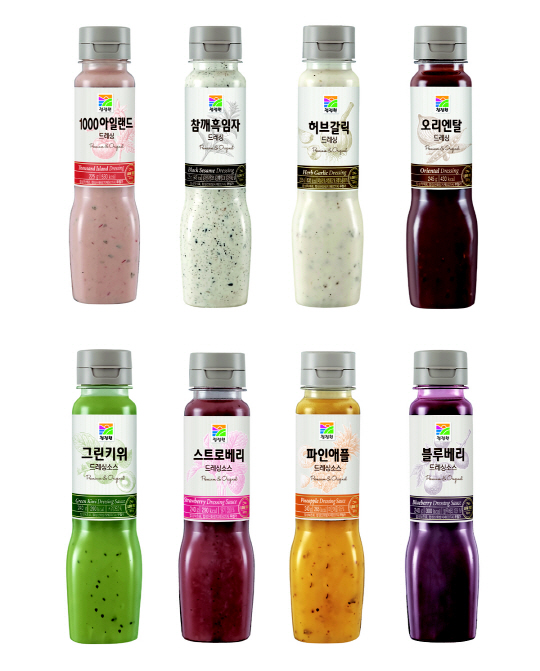 이번에 선보인 제품은 정통 유럽스타일 드레싱 4종 '1000아일랜드', '참깨흑임자', '허브갈릭', '오리엔탈' 과, 프리미엄 저지방 과일 드레싱 4종 '그린키위', '스트로베리', '파인애플', '블루베리'이다.