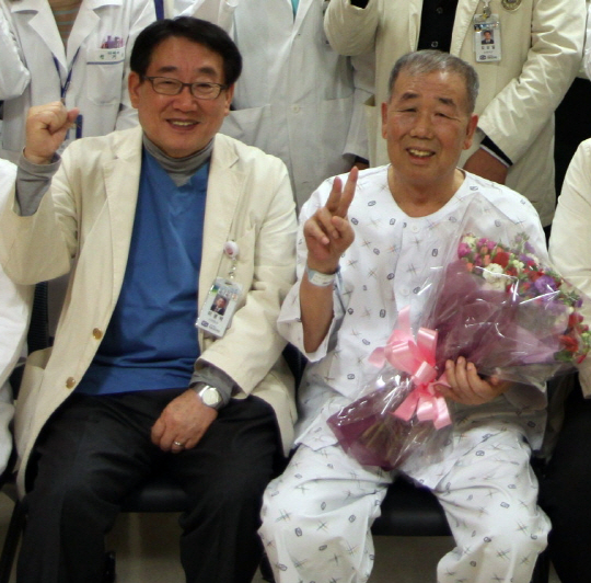 ◇환자 권 씨가 소장이식 수술 후 건강을 회복하고, 수술을 담당한 이명덕 교수와 같이 기념사진 촬영을 했다.