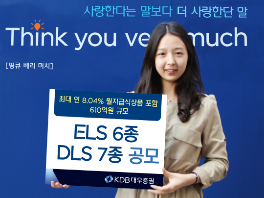 KDB대우증권(사장 김기범)이 최대 연 8.04%의 월지급식 상품을 포함한 ELS 6종, DLS 7종을 9일(화)부터 공모한다. 이번 상품들은 KOSPI200, S&P500, 홍콩항셍중국기업지수(HSCEI), 일본 NIKKEI225, LG이노텍, 고려아연, 중국 위안화, 금·은가격 및 WTI·Brent가격을 기초자산으로하여 총 610억원 규모로 모집한다.