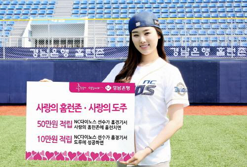 경남은행은 2013 한국야쿠르트 세븐 프로야구 NC다이노스 프로야구단 홈경기 때마다 '사랑의 홈런존'과 '사랑의 도루'를 진행한다고 9일 밝혔다.