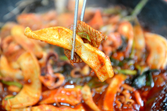 우선 제주 앞바다에서 갓잡아 올린 한치의 껍질을 벗겨 손질한 후 먹기 좋은 크기로 썰어 둔다. 여기에 대파, 당근, 양파를 넣고 발간 양념장과 버무린다. 소스는 고추장, 고춧가루, 생강, 마늘, 후추, 참기름 등 다양한 재료가 들어간다. 어머니를 도와 가업을 잇고 있다는 딸 문경애씨(44)는 "소스의 배합 비법은 어머니만 아실뿐 딸인 나조차도 모른다"며 함박 웃음을 쏟아냈다.