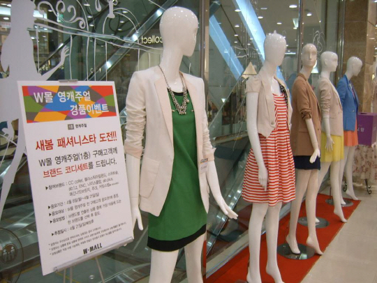 특별이벤트로는 '새봄 패셔니스타 도전' 을 진행해 주크, 나이스클랍, ENC 등 10개 영캐쥬얼 브랜드 마네킹에 연출된 상품을 보고 응모한 고객 10명을 추첨해 코디상품 세트를 증정 할 예정이다.