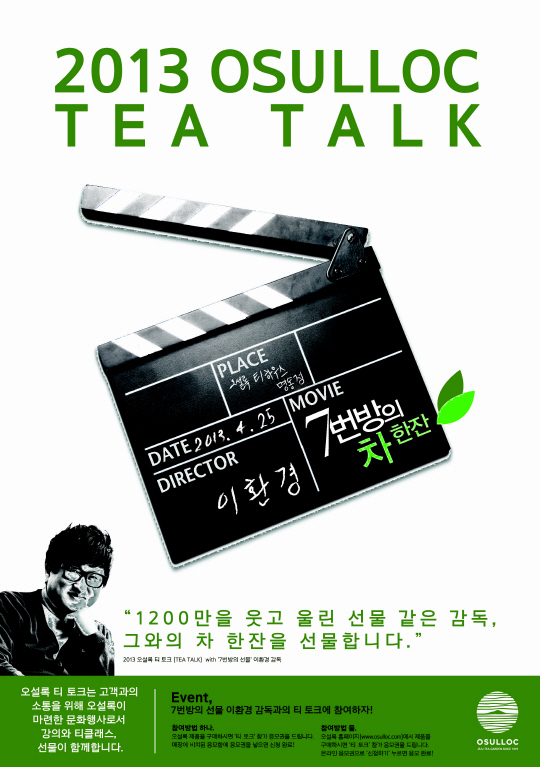 아모레퍼시픽의 프리미엄 차(茶) 브랜드 오설록(OSULLOC)은 이야기, 사람, 그리고 향긋한 티(tea)가 있는 '오설록 티토크(OSULLOC TEA TALK)'를 오는 4월 25일 오설록 티하우스 명동점에서 진행한다. 오설록 티토크는 오설록이 대중과의 소통을 위해 마련한 문화 행사로, 문화계 인사들을 초청하여 함께 이야기를 나누고 공감하는 시간이다. 지난 해에 이어 진행되는 티토크의 주인공은 바로 '7번 방의 선물'의 이환경 감독. 이 행사를 통해 이환경 감독은 그의 영화 인생과 작품 이야기, 그리고 그 속에서의 티(tea)의 의미에 대해 이야기를 전하고, 오설록 티 소믈리에로부터 추천 받은 블렌딩티(Blending Tea)를 관객과 함께 시음하는 등 깊은 소통의 시간을 가질 예정이다. 행사가 끝난 후에 이환경 감독의 친필 사인 엽서와 블렌딩티가 함께 구성된 한정 제품을 판매할 예정이며, 판매 수익금의 일부는 문화계 공익단체에 기부할 예정이다. 오설록 티토크는 4월 9일부터 4월 22일까지 오프라인 매장에서 제품을 구매한 후 응모권을 받아 추첨을 통해 참여 할 수 있으며, 오설록 홈페이지(www.osulloc.com)에서도 같은 방식으로 참여가 가능하다. 오설록은 이번 티토크 이외에도 티 한 잔과 즐길 수 있는 다양한 문화 콘텐츠를 지속 개발할 예정이다