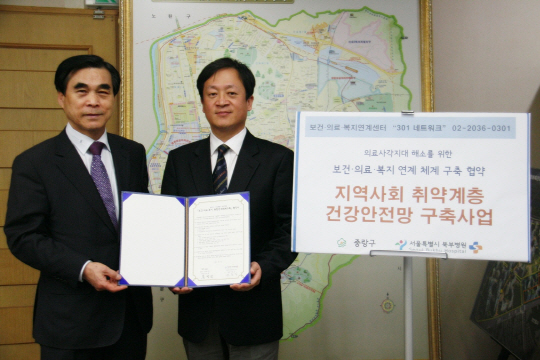 서울특별시 북부병원(원장 권용진)과 중랑구청(구청장 문병권)은 15일 중랑구청 회의실에서 '보건의료복지 통합지원체계 구축' 협약을 체결하고 지역 내 소외계층을 위한 의료 나눔 활동에 적극 협력키로 했다.
