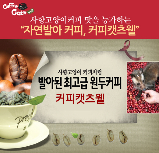 그런데 사향고양이 맛을 한 잔에 2000원에 즐길 수 있다. (주)블루에프앤씨는 사향고양이 커피의 환상적인 맛과 향과 비슷한 느낌의 커피캣츠웰을 선보였다. 사향고양이가 커피 열매를 먹고 뱃속에서 1~2일 동안 품어 발아시키는 환경을 적용해 생산한 제품이다. 사향고양이 커피처럼 발아된 최고급 원두커피다. 2만8천원인 150g제품에서 커피는 15~20잔이 나온다.