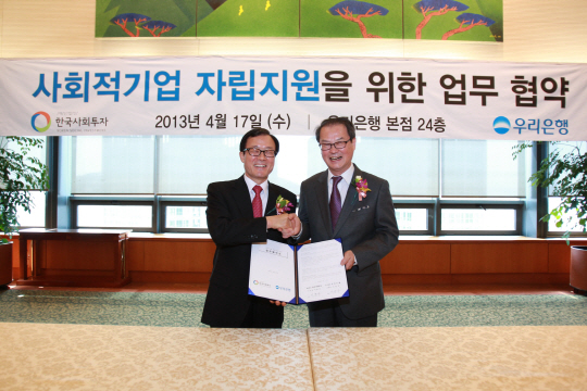 우리은행(은행장 이순우)이 17일 중구 회현동 본점에서 이순우 은행장과 이종수 재단법인 한국사회투자 이사장이 참석한 가운데 사회적기업 자립지원을 위한 업무협약을 체결했다.