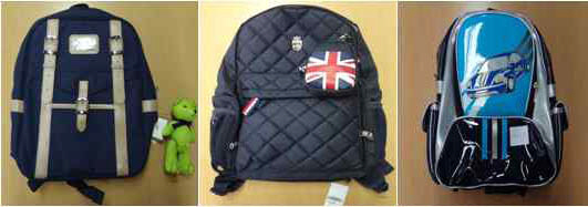 리콜조치 받은 어린이 책가방들. 왼쪽부터 우고무역, 이랜드월드패션사업부, 우고가방이 수입한 중국산 책가방들. 사진제공=산업통상자원부 기술표준원