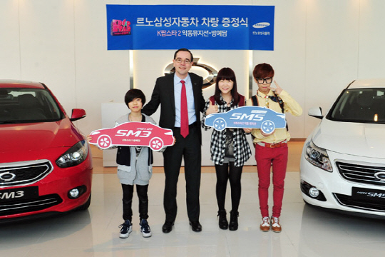 르노삼성자동차는 17일 가산동 사옥에서 최근 인기리에 종영된 오디션 프로그램 'K-POP STAR2'의 우승자 악동뮤지션(이찬혁(18), 이수현(15))과 준우승자 방예담(12)군 에게 각각 New SM5 Platinum과 New SM3를 전달하는 차량 전달식을 가졌다.