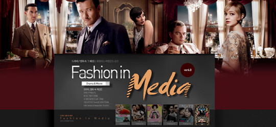 영화 '위대한 개츠비'는 프라다 디자이너가 직접 의상 디자인에 참여했을 뿐만 아니라 명품브랜드와 협업한 만큼 주인공의 남다른 패션 스타일을 엿볼 수 있는 작품이다. 지마켓은 '패션 인 미디어'를 통해 영화 속 배경인 1920년대의 화려하고 아름다운 고전 패션을 재현하고, 이를 현대 유행과 접목시킨 아이템을 제안한다. 주인공 '개츠비'의 수트 스타일, '데이지'의 러블리 스타일과 파티룩, 커플룩 등을 볼 수 있다.