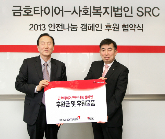 금호타이어가 사회공헌활동의 일환으로 사회복지법인SRC(이하 SRC)와 '안전나눔 캠페인'후원 협약식을 18일 실시했다고 밝혔다.