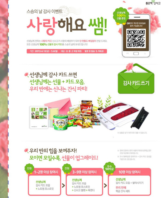 '사랑해요 쌤' 스승의 날 감사 이벤트를 마련하게 됐다"며 "예쁜 편지에 선물, 추가로 간식파티까지 지원받을 수 있는 좋은책신사고의 스승의 날 이벤트에 많은 관심과 참여 바란다"고 말했다.
