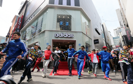 글로벌 리딩 스포츠 브랜드 아디다스(www.adidas.com)는 4월 19일(금)에 국내 최대 규모의 아디다스 명동 플래그십 스토어 리뉴얼 오픈을 기념하여 2NE1과 B-Boy팀(Prepix crew)이 함께하는 댄스 플래시 몹 이벤트를 진행했다.