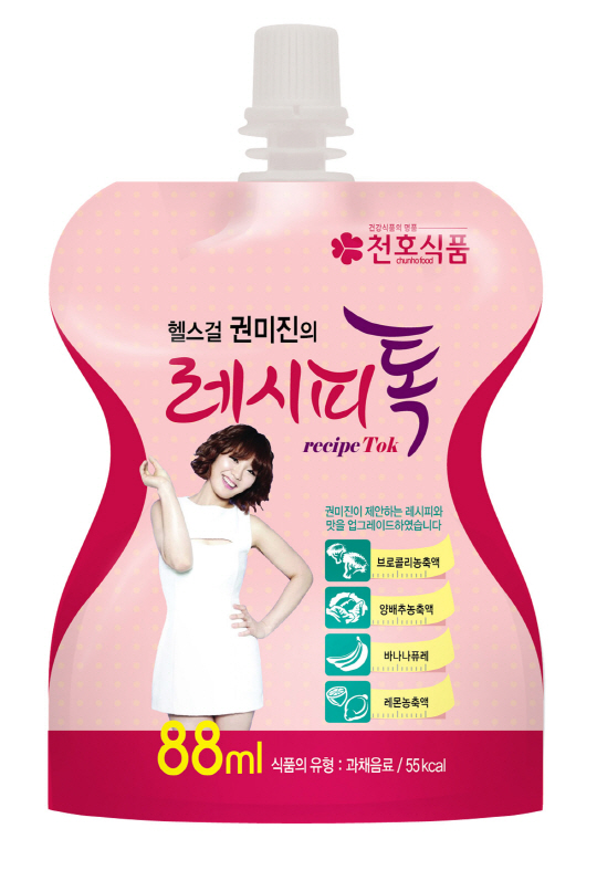 이번에 천호식품이 선보인 '레시피톡'은 건강관리를 통해 새로운 인생을 찾은 권미진이 자신만의 노하우를 전수하며 제품 개발에 적극 참여해 개발된 제품이다. 권미진이 매일 만들어 마셨다는 해독주스의 기본인 당근, 사과, 양배추, 토마토, 바나나, 브로콜리 등 6가지 원료에 건강에 이로운 매실, 레몬, 푸룬, 자색고구마 등을 더해 맛과 영양을 배가시킨 것이 특징이다.