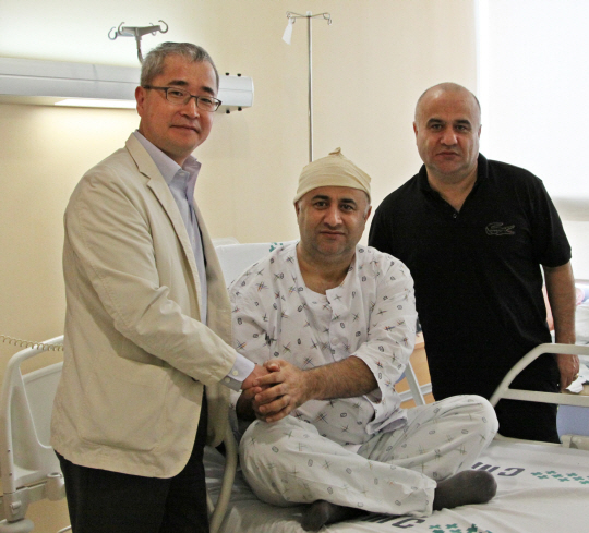 ◇서울성모병원 평생건강증진센터의 신속한 고객응급진료 시스템으로 목숨을 건진 이스칸더(가운데)와 수술을 해준 신경외과 신용삼 교수(왼쪽), 형 싸지야가 함께 기념사진을 찍었다.