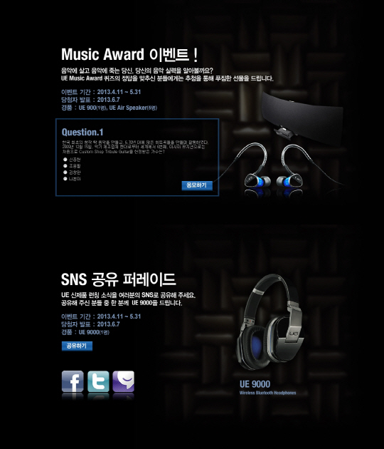 Music Award 이벤트의 경우 행사 기간 내에 로지텍 홈페이지(www.logitech.co.kr)를 방문해 음악 관련 퀴즈 정답을 맞추면 참여가 가능하며, 정답을 맞춘 참여자 중 추첨을 통해 UE 900(1명), UE Air Speaker(5명)이 경품으로 제공된다.
