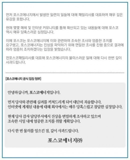 이후 임원 A씨의 폭행 소식이 알려지자 포스코와 포스코에너지 측은 21일 공식 블로그를 통해 "포스코에너지에서 발생한 일련의 일들에 대해 매우 깊은 유감을 표합니다"라며 "현재 몇몇 매체 및 인터넷 커뮤니티를 통해 확산되고 있는 내용들에 대해 포스코 역시 매우 당혹스러운 심정"이라고 밝혔다.