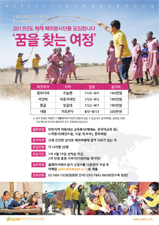 ADRF (아프리카 아시아 난민교육후원회)가 '꿈을 찾는 여정' 2013년도 하계 해외봉사단을 모집을 진행한다. 고등학생, 대학생, 일반인 다양한 연령대가 참가하는 가운데 이번 ADRF 하계 해외봉사단은 오는 7월·8월, 아시아 5개국에 11팀, 총 200여명을 파견할 예정이며 충남교육청 교원팀과 서울 태랑중학교가 함께한다.