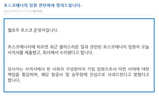 대한항공 승무원을 폭행한 혐의로 논란을 일으킨 포스코에너지 A상무(53)가 결국 23일 사표를 제출했다. 포스코에너지 측은 이 사표를 곧바로 수리했다.