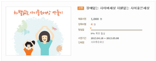 SK커뮤니케이션즈(대표 이한상)가 싸이월드의 사회공헌 프로그램인 사이좋은 세상(cytogether.cyworld.com)에서 지난 11일부터 시행된 장애인 차별금지법 (이하 장차법)에 맞춰 웹 접근성 인식제고를 위한 지지 서명 캠페인을 진행한다.