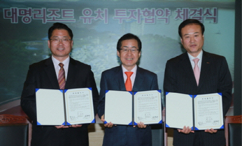 지난 16일 경남도청에서 박흥석 대명그룹 총괄사장, 홍준표 경남지사, 정현태 남해군수 등이 '남해군 설리지구 리조트 조성사업'에 관한 체결식이 거행되었다.