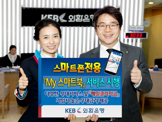 외환은행(은행장 윤용로 / www.keb.co.kr)은 실물없이 스마트폰에서 편리한 부대 서비스와 신규 적금 가입시 높은 우대금리가 제공되는 예금통장인 「My 스마트 북」 서비스를 시행한다고 25일 밝혔다.
