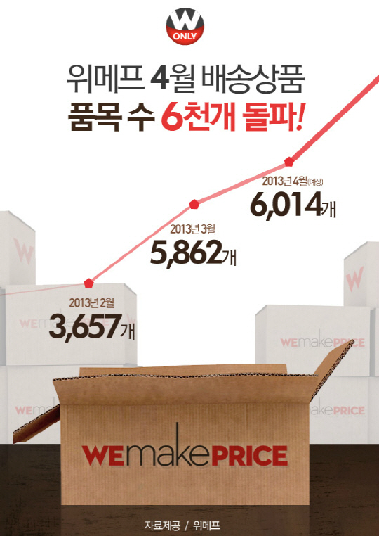 2012년 4월의 배송상품 오픈 딜 개수가 1892개였던 위메프가 1년 사이에 품목 수를 3배 이상 증가시켰고 이것은 다양한 상품들로 소비자들의 선택의 폭을 넓혀 더욱 편리한 쇼핑공간으로 만든다는 위메프의 전략이 반영된 것이다.