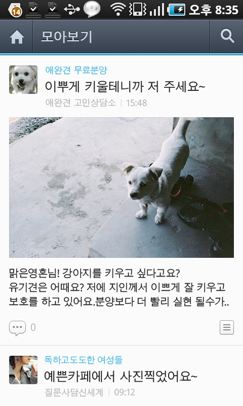'모아보기'는 콘텐츠로의 빠른 접근과 소비를 원하는 모바일 이용자들의 특징에 맞춘 서비스다. 가입한 카페들의 여러 게시판 중 자주 가는 게시판을 즐겨찾기 설정하면 모아보기 메뉴에서 내가 선택한 게시판의 글들만 한 눈에 볼 수 있다. 개별 카페와 게시판을 찾아가는 동선을 축소하고, 타임라인 형식으로 콘텐츠를 제공해 편리함을 더했다. 모아보기 화면에서는 하나의 게시물 당 최대 30장의 사진을 슬라이드로 확인하고, 동영상을 바로 재생하는 것이 가능하다.