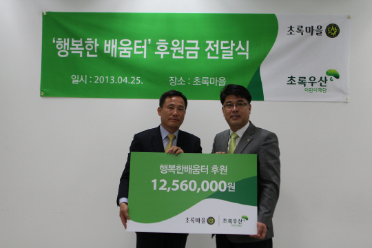 친환경·유기농식품 전문점 업계 1위 초록마을(대표이사 박용주)이 지난 4월 26일 상봉동 초록마을 본사에서 어린이재단 '초록우산'과 '행복한 배움터' 후원 협약식을 갖고 1,256만원의 후원금을 전달했다.