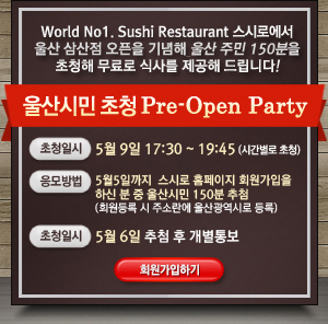 세계 최대의 회전초밥 레스토랑 스시로한국(대표 최세철)은 스시로 울산 삼산점 오픈을 앞두고 울산시민들을 대상으로 오는 5월 9일 프리 오픈 파티를 개최한다고 밝혔다.