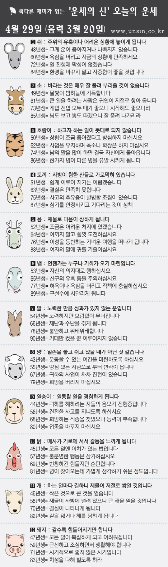 [직장인을 위한 오늘의 운세] 2013년 4월 29일 월요일(음력 3월 20일)