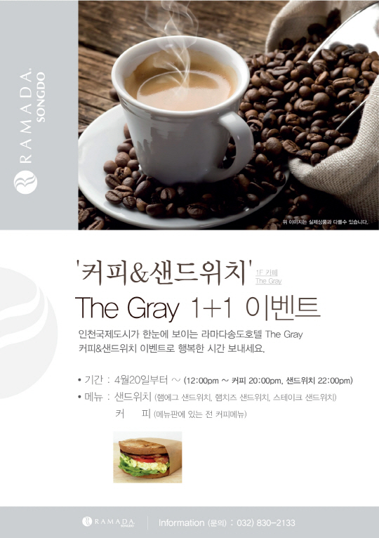 따스한 봄기운을 받고 커피가 선사하는 향긋한 유혹을 즐기며 좋은 사람과의 진솔한 이야기 를 할 수 있는 라마다송도 로비라운지 The Gray에서 준비한 커피&샌드위치 이벤트로 초대 한다. 문의전화 032-830-2133
