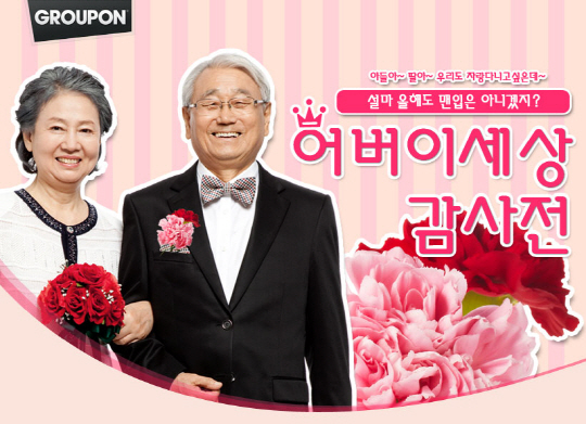글로벌 No.1 소셜커머스 기업 그루폰(대표 김홍식, www.groupon.kr)이 어버이날을 위한 전 고객 대상 1만원 전국 꽃배달 할인권 증정부터 다양한 건강 및 미용, 아웃도어 선물 그리고 부모님과 함께 영화 한 편을 파격적인 가격으로 볼 수 있는 메가박스 54개 지점 사용 가능 할인 쿠폰까지 준비한 '어버이날 감사전'을 내달 3일까지 4일간 진행한다.