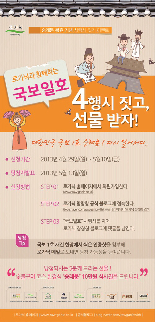 4월 29일부터 5월 10일까지 2주간 진행되는 '국보 1호 사행시 짓기 이벤트'는 로가닉 공식 블로그(http://blog.naver.com/rawganicwith)에 숭례문 복원을 축하하는 내용으로 '국보일호' 사행시를 지어 댓글로 남기면, 당첨된 5명에게 숯불구이 한정식 브랜드 '숭례문'의 10만원 식사권을 선물한다.