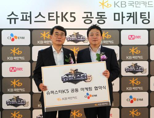 KB국민카드와 CJ E&M은 2일 서울시 마포구 상암동 CJ E&M 미디어홀에서 KB국민카드 지동현 부사장, CJ E&M 김계홍 방송부문대표 등 양사 관계자들이 참석한 가운데『슈퍼스타 K5』 공동마케팅 협약을 체결했다.