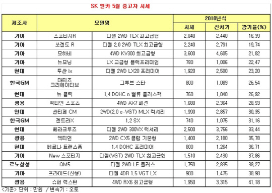 중고차 브랜드 SK엔카에서 2010년식 국산 SUV와 경차의 감가율을 비교한 결과, 기아 스포티지R, 쏘렌토 R, 모하비가 뉴모닝보다 더 낮은 감가율을 기록했다고 밝혔다.