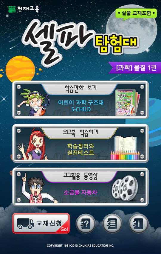 '셀파탐험대' 애플리케이션은 과목별(수학, 과학, 역사)로 구성되어 있으며, 과목별 8권씩 총 24권이 개별 애플리케이션 형태로 제공된다. 교과 과정을 비롯하여 교과서 밖의 다양한 지식이 어우러져 구성되어 있으며, 만화내용을 학습과 연계하여 생각해 볼 수 있도록 핵심노트도 함께 제공한다. [소비자인사이트/스포츠조선] 박재호 기자 jhpark@sportschosun.com